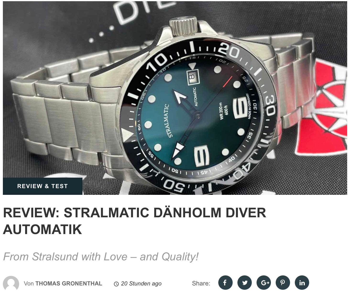 Unsere Taucheruhr Dänholm wurde durch den bekannten Uhrenspezialisten Thomas Gronenthal auf Herz und Nieren getestet. Dabei schnitt unsere STRALMATIC Diver ausgezeichnet ab und erhielt ein qualitatives Lob bei einem hervorragenden Preis-Leistungsverhältnis. Der unabhängige Journalist publiziert unter anderem für die Fachzeitschriften UHRENMAGAZIN, CHRONOS sowie dem Schweizer GOLD`OR.