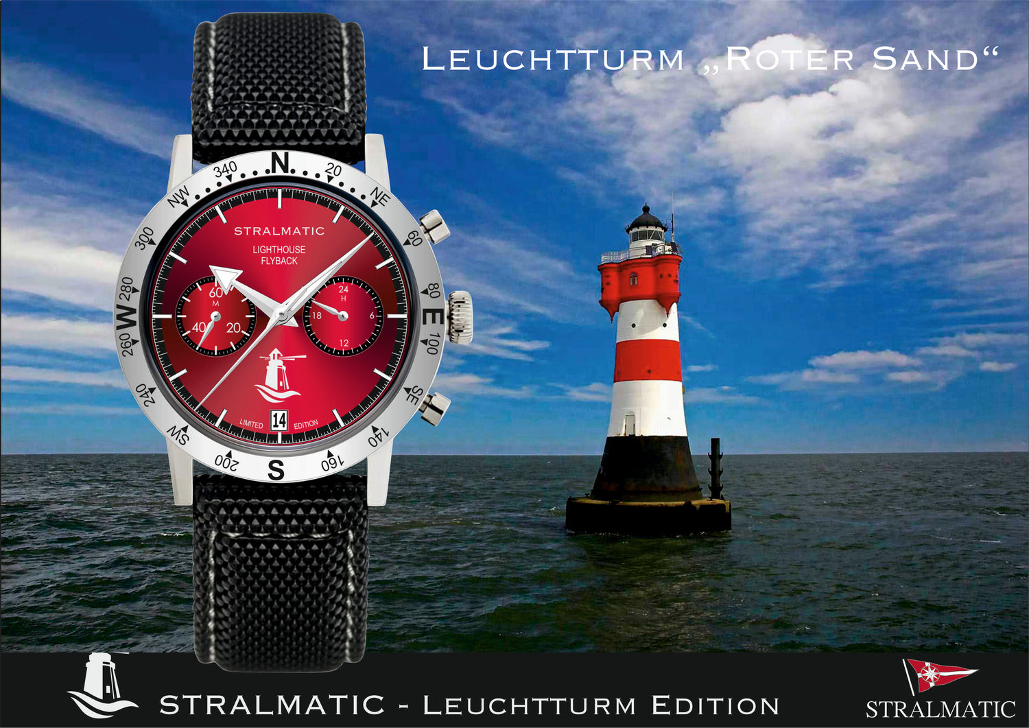 Inspiriert von den Leuchttürmen an der Deutschen Küste entstand unsere auf jeweils 99 Stück limitierte Serie. In Anlehnung an die Leuchttürme "Roter Sand", "Rügen", "Warnemünde", "Kiel- Bück" und "Travemünde" haben wir die Uhren entworfen und dem maritimen Thema entsprechend ausgestattet.